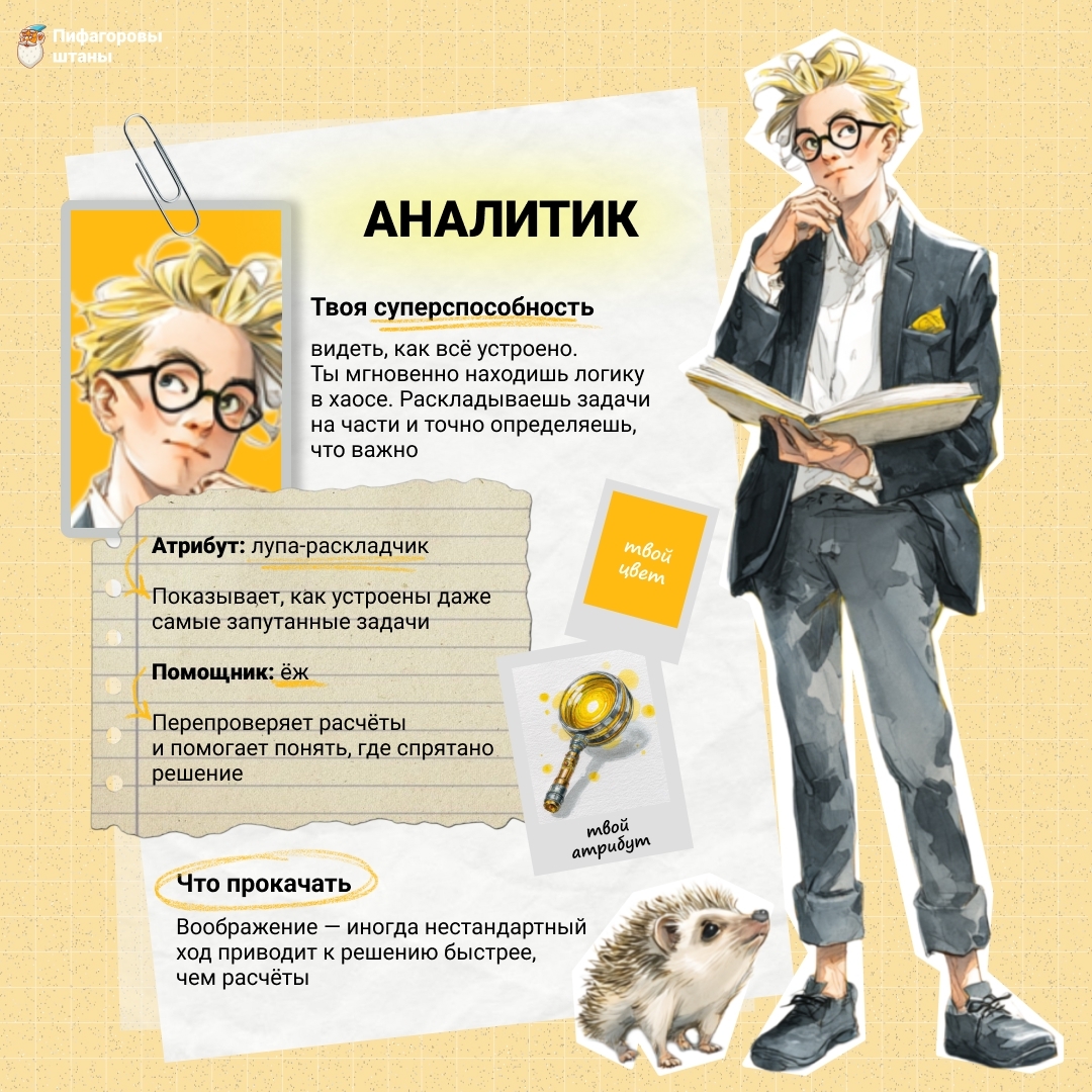 Он внимателен к деталям, умеет находить закономерности, анализировать данные и проверять гипотезы. В математике он силён в задачах, где нужно искать ошибки, сопоставлять данные, строить выводы на основе фактов