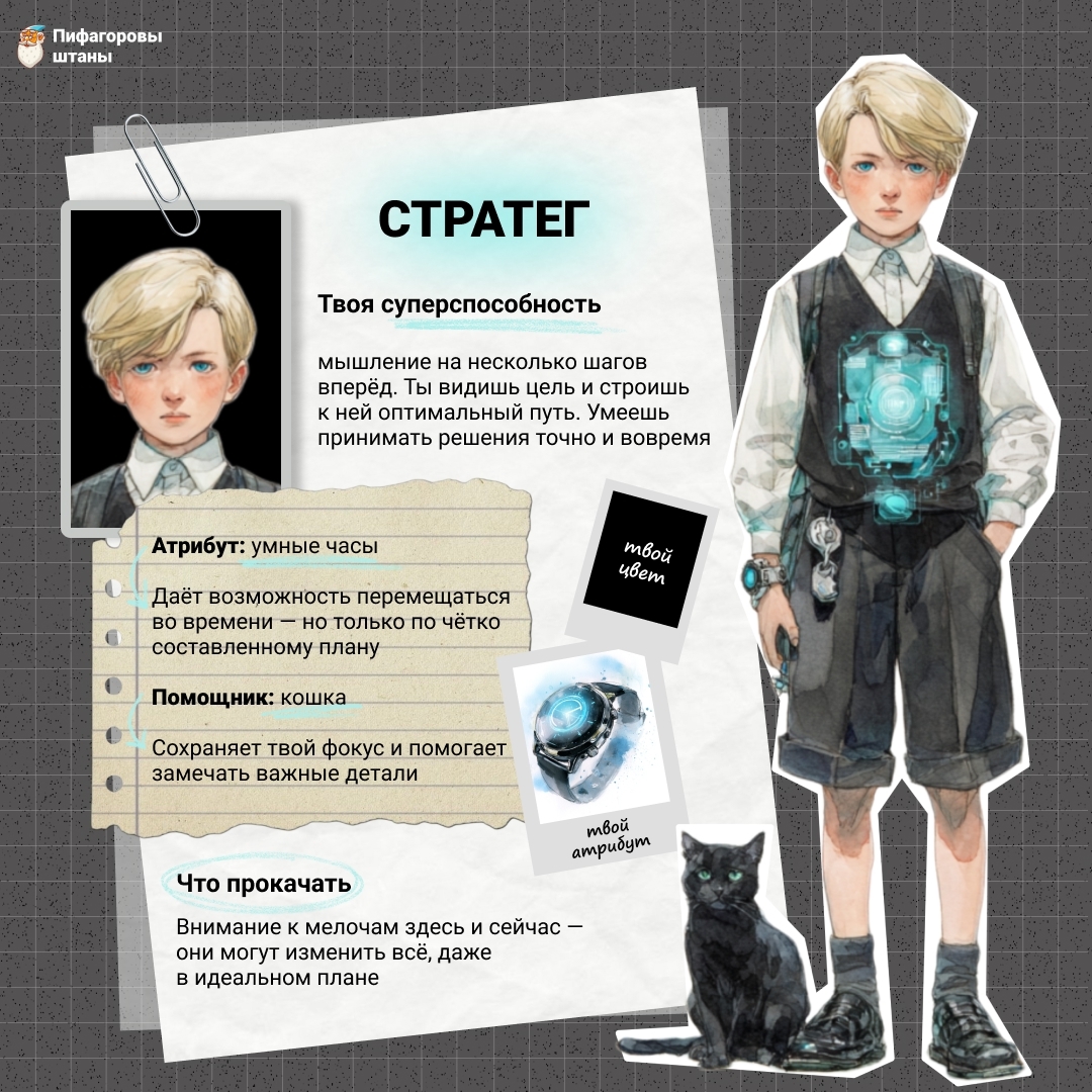 У вашего ребёнка основной тип личности — Стратег. Он умеет планировать, видеть логику и закономерности, мыслит последовательно и тщательно проверяет каждый шаг