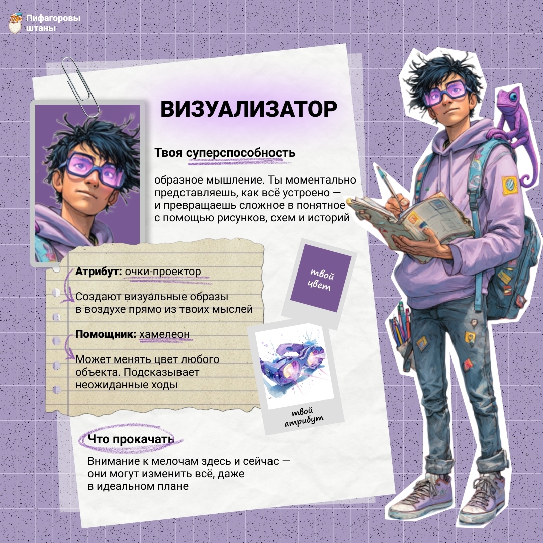 Ваш ребёнок воспринимает информацию лучше, когда видит её в виде схем, рисунков, таблиц и образов. В математике он быстрее понимает задачи, если их можно изобразить наглядно, и запоминает решения, когда они оформлены красиво и понятно